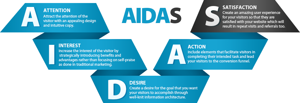 At Blue media we believe that for maximum output, Conversion rate optimization should be based on the AIDA model with an additional "S":